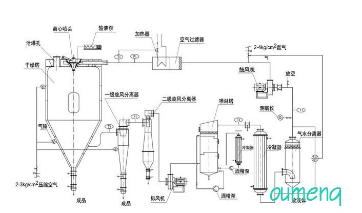 裝置**針對(duì)于有機(jī)溶劑,以使用循環(huán)氮?dú)舛纬傻亩栊詺怏w介質(zhì)取代通常的空氣介質(zhì),來(lái)進(jìn)行噴霧干燥。除了能回收產(chǎn)品之外,尚可回收有機(jī)溶劑。針對(duì)有機(jī)溶劑低閃點(diǎn)或者微毒的特點(diǎn),易燃易爆的特點(diǎn)**設(shè)計(jì)該套閉式循環(huán)噴霧系統(tǒng)。